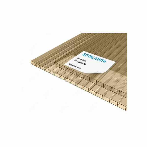 Сотовый поликарбонат 8 мм SOTALIGHT бронза 2100х6000 мм - это прочный и легкий материал, который отлично подходит для использования в различных строительных и дизайнерских проектах. Поликарбонат обладает высокой прочностью и устойчивостью к воздействию внешних факторов, что делает его идеальным выбором для создания крыш, навесов, ограждений и других конструкций.
